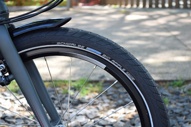 Uns belos Schwalbe Big Apple, os pneus mais conhecidos por estas andanças, que têm um efeito suspensão e protecção antifuro. A roda (aros e raios inox) são de muita qualidade, da Sapim.
