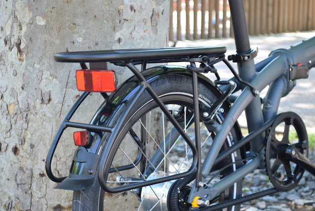 A Link D7i também traz uns excelentes guardalamas e um robusto suporte traseiro com ganchos elásticos. Este suporte não é tão comprido como o Cargo rack, mas pemite levar alforges não muito largos, como por exemplo os Big Mouth da Tern, que tem ganchos da Ortlieb, sem bater lá com os pés (depende do tamanho do pé!! o meu 42 é tranquilo:))