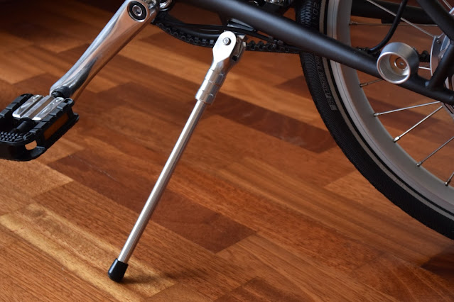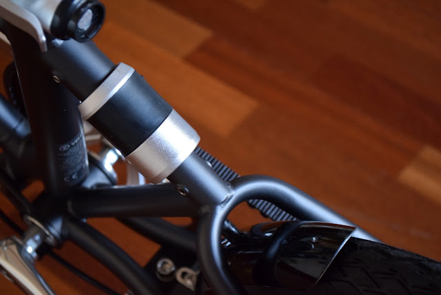 Esta das fotos foi-me pedida por uma pessoa que mede cerca de 1m60 por isso teve de levar o espigão mais curto. Apesar da Vello me cobrar o extra eu não o faço. Pode-se também cortar. Esta é um detalhe pouco comum nas dobráveis e o motivo é simples, o espigão só desce quando a parte traseira (escora) se destaca do íman e vem para a frente, ficando o tubo do espigão desimpedido. Uma desvantagem disto é que com o espigão mais curto ela vai apenas apoiar na chapa que encaixa no íman e não no peça preta do espigão de selim. Não há problema na funcionalidade mas tem de se ter cuidado com o chão da casa