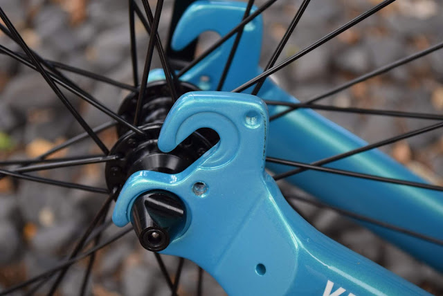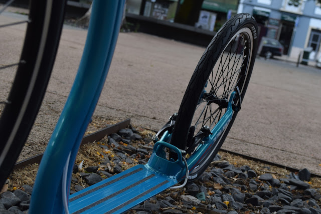 Nunca foi tão importante ter bons cubos como numa footbike. Reduzir ao máximo o atrito das peças para a coisa deslizar mesmo bem. Neste caso Novatec. Idênticos aos encontrados nas bicicletas Dahon e Tern. A roda vem com 2 raios brancos a condizer com os cabos, incrível :))