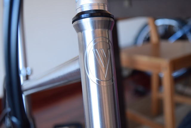 O logo da VELLO de titânio é cravado no quadro em vez de ser uma comum chapa (como na versão chromoly)