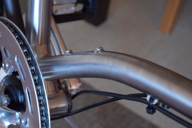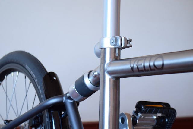 O logo da VELLO é cravado no quadro de titânio em vez de ser uma chapa como na versão chromoly